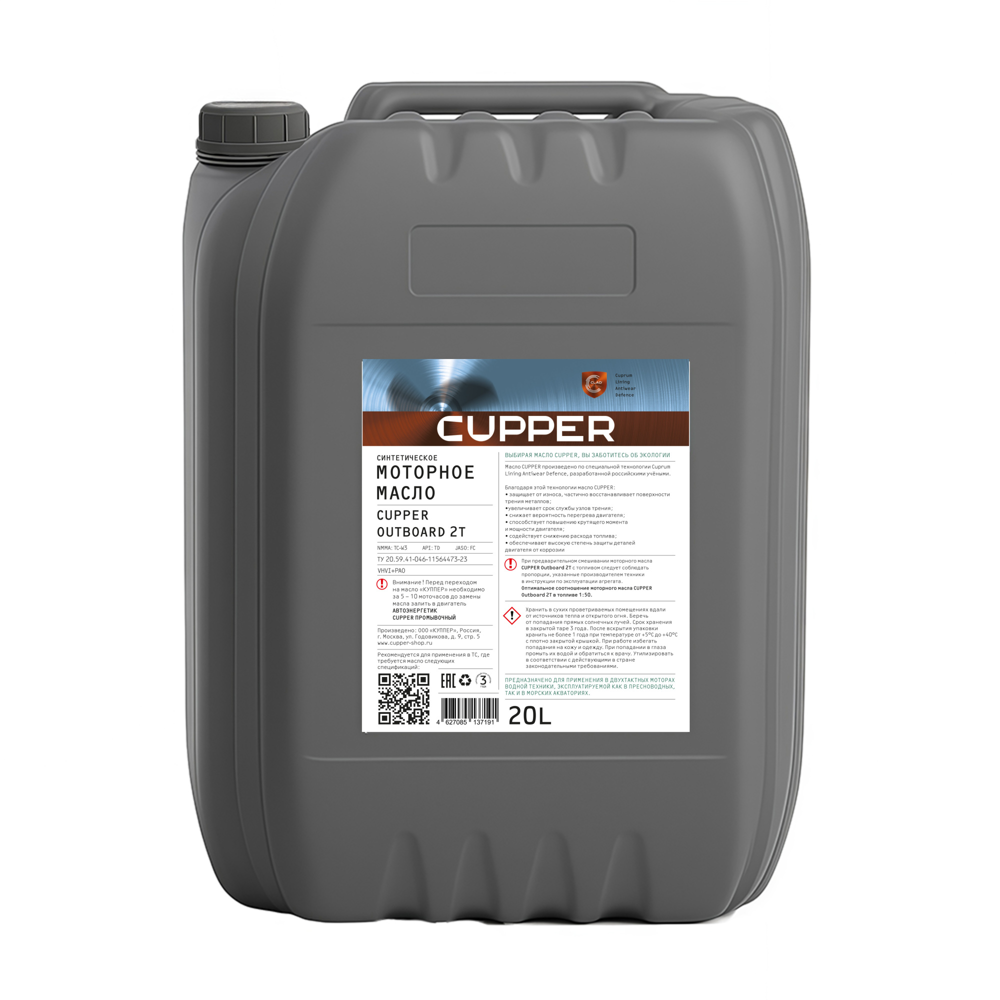 CUPPER OUTBOARD 2T – cинтетическое моторное масло для двухтактных подвесных лодочных мотороd водяного или воздушного охлаждения работающих на топливо-масляной смеси. Создано с использованием базовых масел на полиальфаолефиновой (PAO) основе с применением собственной запатентованной технологии CLAD® (Cuprum Lining Antiwear Defence). Пакет присадок, содержащий медь в ионном виде, обладает уникальными антифрикционными, противоизносными и противозадирными свойствами, значительно увеличивающими срок службы узлов трения и всего двигателя. Способно частично восстанавливать металлические поверхности трения. Не содержит серу и фосфор, имеет минимальную сульфатную зольность.